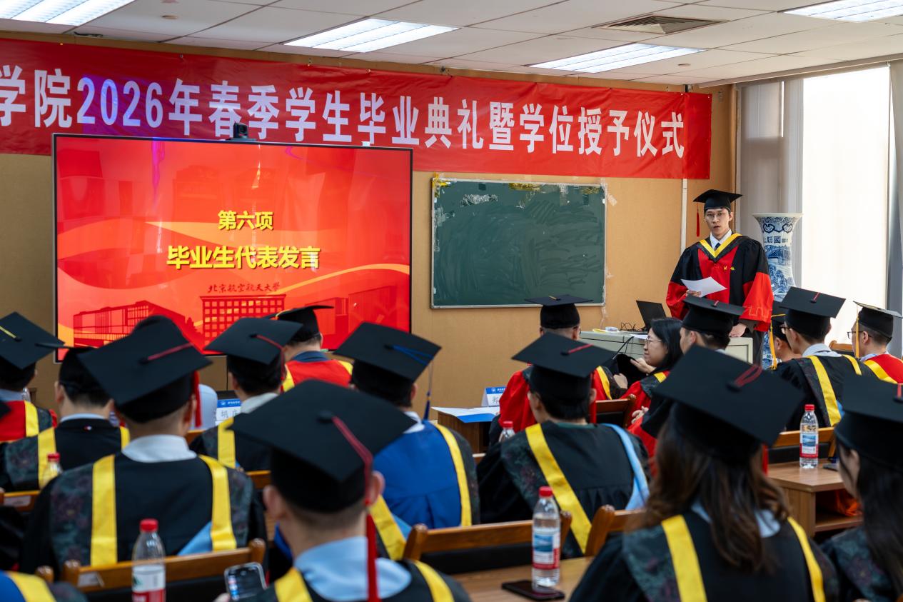 畢業(yè)生代表、2021級(jí)博士研究生董家寶發(fā)言。作為一名在北航度過(guò)整整十個(gè)春秋的學(xué)子,董家寶深情回顧了自己從2016年進(jìn)入沈元學(xué)院,到堅(jiān)定選擇自動(dòng)化學(xué)院,最終從一名青澀的“做題家”成長(zhǎng)為主持國(guó)家自然科學(xué)基金青年學(xué)生項(xiàng)目、斬獲國(guó)家獎(jiǎng)學(xué)金的科研工作者的蛻變歷程。他感慨道,比榮譽(yù)更珍貴的是在北航探索未知、深度鉆研的那股勁頭。面對(duì)未來(lái),他立志秉承“堅(jiān)守空天志,敢為天下先”的號(hào)召,將北航人的堅(jiān)韌與執(zhí)著帶入廣闊天地,為建設(shè)世界科技強(qiáng)國(guó)貢獻(xiàn)力量。